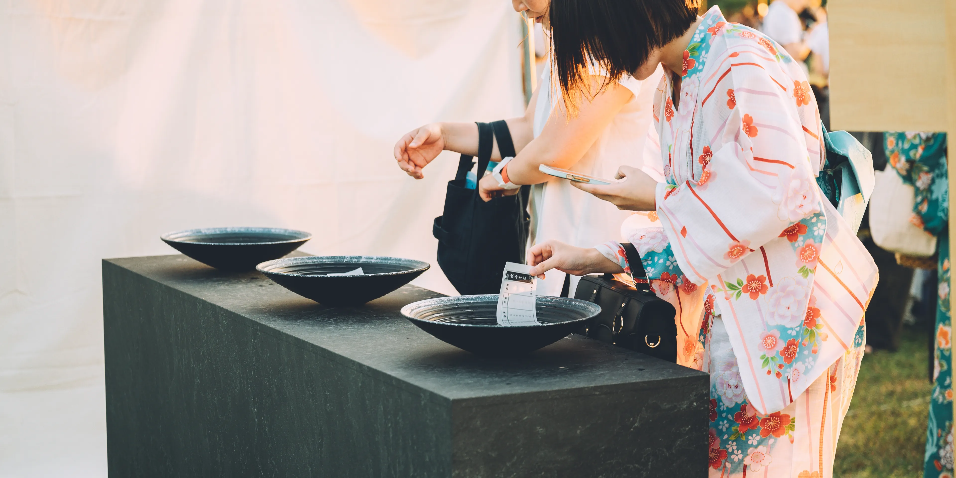 涼やかな夏を感じる水みくじで、あなたの運勢を占おう。気になる結果は笹の葉に結んで吹き飛ばします!